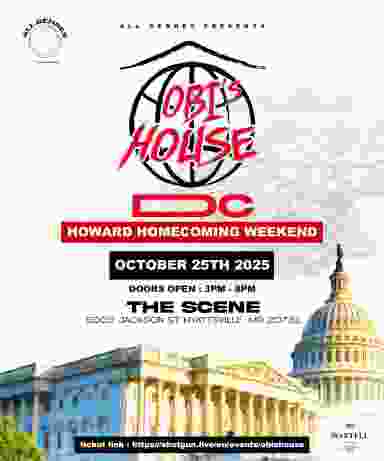All Genres presents Obi’s HOUSE DC. We’re bringing the ultimate Howard's Homecoming Day Party to DC — filled with vibes, all genres of music, and unforgettable energy. Pull up, dance, and celebrate. This is a DETTY DECEMBER PREGAME. TABLE PACKAGES THE VIBE: Reservation Fee :$500, Table Value: From $2,500 x 5 Wrist Bands OBI's House: Reservation Fee :$750, Table Value: From $3,500 x 7 Wrist Bands LAGOS: Reservation Fee :$1000, Table Value: From $5,000 x 10-12 Wrist Bands PLEASE call/text 832-703-9124 OR DM @allgenresproduction on IG for more info