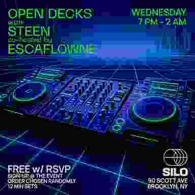 Hosted by DJ and musician Steen, Open Decks is a creative and fun space where DJs can hang and share their house and techno music live. Hear your favorite or original tracks on Silo's front room sound system, a custom 15,000 watt Danley powerhouse. If you want to play, talk to Steen to sign up. Sign-up is in person at the event only, slots are 12 minutes. The first 3 DJ's play first-come-first-spin. Then we'll select names randomly from the sign-up list throughout the night. You'll get a half hour notice before your set time. This is to ensure that DJ's who can't make the initial sign up right at 8pm still get a chance to play. Free with advance RSVP. Question? Hit up your host on IG @steenschmidt This week's co-host is Escaflowne. In SILO's front room. Limited capacity.