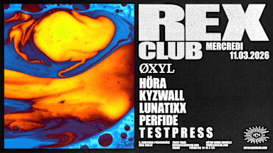 Le 𝗺𝗲𝗿𝗰𝗿𝗲𝗱𝗶 𝟭𝟭 𝗺𝗮𝗿𝘀, ØXYL revient au Rex Club pour un deuxième rendez-vous, cette fois avec une vibe résolument trance. Un mercredi soir qui casse la routine, pensé pour celles et ceux qui veulent prolonger la soirée jusqu’au bout de la nuit. Le Rex Club, c’est un lieu à part dans l’histoire des musiques électroniques. Chaque passage y a une saveur particulière, et cette nouvelle date s’inscrit dans cette continuité : 𝘂𝗻 𝗰𝗹𝘂𝗯, 𝘂𝗻 𝗽𝘂𝗯𝗹𝗶𝗰, 𝘂𝗻𝗲 𝗲́𝗻𝗲𝗿𝗴𝗶𝗲 𝗾𝘂𝗶 𝘀𝗲 𝗰𝗼𝗻𝘀𝘁𝗿𝘂𝗶𝘁 𝗮𝘂 𝗳𝗶𝗹 𝗱𝗲𝘀 𝗵𝗲𝘂𝗿𝗲𝘀. Pour l’occasion, une programmation trancy et directe : kicks tendus, mélodies qui accrochent, montées euphoriques… cinq artistes réunis pour vous faire vivre un mercredi comme un moment unique. 𝗟𝗜𝗡𝗘-𝗨𝗣 [a-z] ø HÖRA ø KYZWALL ø LUNATIXX ø PERFIDE ø T E S T P R E S S 𝗜𝗡𝗙𝗢𝗦 ø Billets en bio ø Horaires : 23h30 - 06h00 ø Rex Club, 75002 Paris