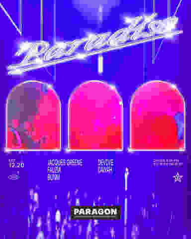 A night from the other side. Bass mutations, house rhythms, sonic fantasies. Don’t be late, PARADISO waits for no one. Critically-acclaimed house/garage producer Jacques Greene teams up with UK jungle/club superstar and Myrtle/Broadway via Miami's notorious internationally feared and sought-after Bunni for a night of innovative-yet-accessible, beautiful dance music. Take a short trip downstairs for the deep-and-dark techno of Paragon favorite DAIYAH and cross-genre wizard Devoye. Paragon is 21+. Arrive early to avoid lines. Ground floor is ADA compliant. Dress 2 impress. Be nice to each other. No Racism No Sexism No Homophobia No Violence Please notify security if you witness any harassment. Dress 2 Impress. Find the feeling, don’t let go.