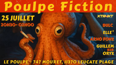 POULPE FICTION __________________ XTR4KT débarque au poulpe pour sa toute première !! Le sable, la mer, la nuit et les BPM qui montent Rejoins nous pour faire vibrer la côte au rythme de la Techno !! Il y en aura pour tous les goûts ! __________________ ● ARNO FONS ● BULC ● ƎLLE² ● ORYX B2B GUILLEM On t’attend pour tout retourner ! T’es prêt(e) ?! LE POULPE Club de plage ( Leucate) 25 JUILLET 2025 21H / 2H TECH HOUSE / HARDMUSI __________________ *Évènement réservé aux majeurs. La direction se réserve le droit d’entrée*