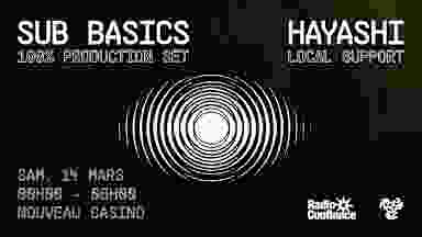 Première parisienne pour Sub Basics, il jouera un set 100% composé de ses propres productions. Décrit comme une figure majeure de la scène dubstep UK par le label Bait, il mélange dubstep et techno 4x4 avec des sorties sur les labels Foundation Audio, Temple of Sound, CNCPT Collective, Lion Charge... Hayashi, figure montante de la scène parisienne, mélange jungle, bass music, dub et techno. Fondatrice du collectif Rendez-Vous (talks et masterclasses autour de la musique électronique), elle a sorti son premier EP en 2025 sur Unfair Records. Présenté par Bigger Life et Radio Confiance