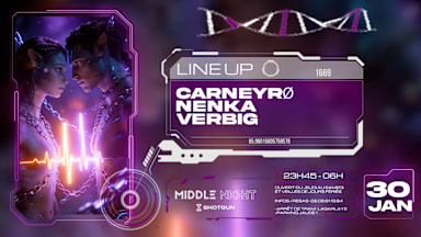 ⛓️Vendredi 30 Janvier ⛓️ ________________________________________ 🎵 LINE-UP ▀▀▀▀▀▀▀▀▀ ⚡️CARNEYRØ ⚡️NENKA ⚡️VERBIG ____________ 📍 INFOS PRATIQUES ▀▀▀▀▀▀▀▀▀ 🗓️ Date : Vendredi 30 Janvier 2026 🕒 Horaires : 23h45 – 06h00 🎫 Préventes prioritaires jusqu’à 1h 🎽 Vestiaire offert avec la prévente ⚠️ Nombre de préventes limitées ! 📍 Lieu : Middle Night — 12-14 Rue Ramond, Clermont-Ferrand 🚋 Tram : Arrêt Lagarlaye (2 min à pied) 🚗 Parking : Centre Jaude 1 (5 min à pied) La nuit est à vous, vivez-la sans excès !!! Celui qui conduit, c’est celui qui ne boit pas. L’abus d’alcool est dangereux pour la santé, à consommer avec modération.