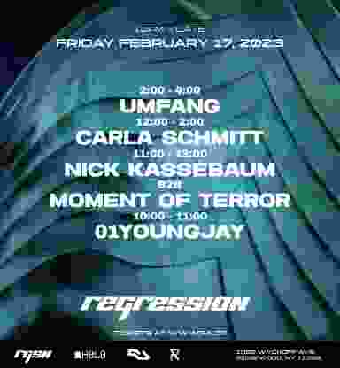 Regression Records Night Club: UMFANG Carla Schmitt Nick Kassebaum b2b Moment of Terror 01youngjay Bar: Ste-vi Raven Hosts: Maia Celardolor Tafari