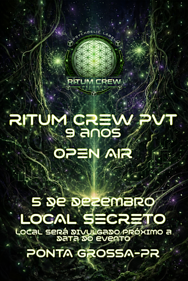 Após 9 anos, vamos nos reencontrar. Nossa última open air foi em 2017. De lá pra cá muita coisa mudou. A cena evoluiu, a gente amadureceu e a visão ficou maior. Agora é hora de iniciar uma nova fase. Mais estruturada, mais consciente e preparada, mas com a mesma energia que sempre fez a diferença. O reencontro tem data, local e propósito. A história continua. Nos vemos na pista. A Ritum Crew Records apresenta: 🔺 RITUM CREW PVT – 9 ANOS • 23 horas de evento • VJ Mapping • Sistema de som de qualidade • Camping • Bar com preços justos • Vans saindo do centro da cidade (para quem não tem como ir) • Local secreto (13km do centro da cidade – em um dos rios mais conhecidos da região, passando por dentro do espaço) • Line Up do Progressive ao Hitech