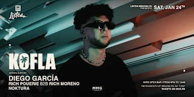 The Factory X Listen Bringing the iconic Ibiza party spirit to the heart of Brooklyn KOFLA talent and a renowned DJ From Brooklyn Miami and Ibiza will be taking over the decks, delivering those irresistible vibez SUPPORT BY DIEGO GARCIA RICH POUERIE B2B RICH MORENO NOKTURA Make sure to secure your advanced tickets to save and party till dawn! Not To be missed DOORS 8PM