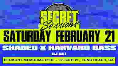 SECRET SESSIONS Saturday, February 21 Belmont Pier — Long Beach, CA We return to the water for a special edition of Secret Sessions as we bring together two of the West Coast’s most respected producers for an extended B2B set. SHaded × Harvard Bass — 2 Hour Set Known for shaping the modern house and techno sound, both artists have released standout records on labels including Dirtybird, Relief, and Kneaded Pains. From peak-time club weapons to deeper, rolling cuts, this pairing promises a proper journey — not a festival sprint. Expect a sunset start, ocean air, and a full-scale production experience as we take over the pier for one of its final season events. — 2 stages of music — Live artists & immersive installations — Full bar — Outdoor waterfront setting Limited capacity. Early arrival strongly recommended. 21+ Secret Sessions Pier Party 2/21 : 2pm-10pm 35 39th Pl, Long Beach, CA 90803 Official Afters 2/2124: 10pm-2am Downtown Long Beach Location