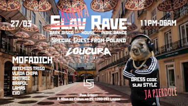Slav Rave Kurwa – 27/03 🕚 From 23:00 to 06:00, join us at the legendary Pink Street in Loucura Club! Expect some fresh new tracks, a special guest straight from Poland – Mofadich, a collaboration with Low Session, and three Brazilian artists. Line-up for the night: • Mofadich • Dmitroz • Artemios Trigo • EVO • Vlada Chipa • Lamas • Brapol Dress Code: Slav Style ya pierdole 📍 Loucura Club, Pink Street R. Nova do Carvalho 24, 1200-292 Lisbon 🎟️ Tickets: Online tickets are cheaper than at the door. Prices increase as the date approaches. All tickets are refundable.