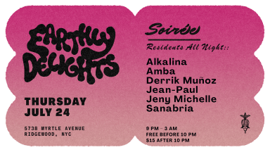 Legendary NYC party Soirée takes over the rave cave to showcase their current residents, all night long. LINEUP :: Alkalina, Amba, Derrik Muñoz, Jean-Paul, Jeny Michelle, Sanabria