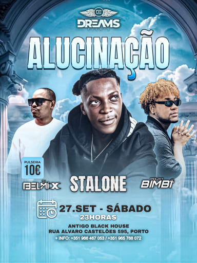 Dreams events apresenta ALUCINAÇÃO Pela primeira vez no PORTO Live act:STALONE Música by:Dj BIMBI e Dj BELMIX 📍Rua Álvaro Castelões 595 Porto +INF:966467053