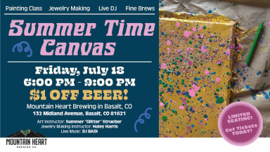 Summer Time Canvas is the vibe you need to feel inspired and motivated for the rest of your summer season! 6-9pm Art Class will be led by local Summer Glitter Strueber of Glenwood Springs, CO! Venue is Mountain Heart Brewing @ Mountain Heart Brewing in Basalt, CO. All supplies will be provided and you will take home your one of a kind art at the end of your session! DJ BADi will be playing music to provide the perfect energy for your inspiration! https://soundcloud.com/badimarcel You can book one of two sessions (6pm-7:30pm + 7:30pm-9pm) for your main art piece 16"x20" stretched canvas. Avon local Haley Harris will bring supplies for you to make jewelry or you can just vibe to BADi's DJ set and enjoy yourself with one of Mountain Heart Brewing's wonderful brews!