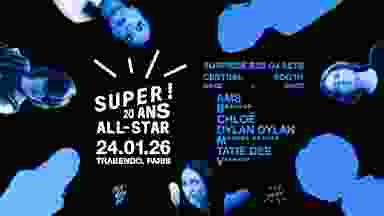Super! & le Trabendo présentent : SUPER! 20 YEARS ALL STAR CLUB Samedi 24 janvier 2026 | 00h00 – 06h00 | Trabendo, Paris Super! fête ses 20 ans et s’empare de la Villette pour une nuit entière, le samedi 24 janvier 2026. Plus tôt dans la soirée, Four Tet investit le Zénith avec le retour de son désormais mythique set de 5 heures au cœur de 6000 personnes. Quand les lumières se rallument, la nuit, elle, continue. De minuit à 6h, le Trabendo passe en mode after avec un line-up 100% Super! et une chaîne ininterrompue de back-to-back (et de back-to-back de back-to-back), pensée pour tenir le dancefloor jusqu’au matin. Sept DJs de la scène parisienne — entre nouvelles têtes et figures historiques — se relaient derrière les platines, installées au centre du dancefloor. -------- LINE-UP * • AMS • B✽✽✽✽✽✽ • CHLOÉ • DYLAN DYLAN • M✽✽✽✽✽ ✽✽✽✽✽✽ • TATIE DEE • V✽✽✽✽✽✽ --------- Six heures de house, techno, acid et breaks. Pas de pause. Pas de décor. Juste le son. --------- • Préventes exclusives pour les détenteurs d’un billet Four Tet au Zénith • Billet bundle Zénith + Trabendo disponible sur la billetterie Four Tet au Zénith --------- * Ce line-up au Trabendo sera 100% Super! mais Four Tet jouera exclusivement au Zénith de 19h00 à 00h00. [CLUB]