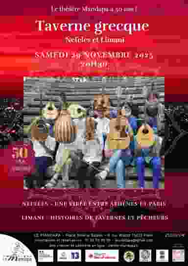 ʳᵉ partie : Une virée entre Athènes et Paris Nefeles, trio de musique grecque, rend hommage à une tradition musicale riche en mélodies et chansons, toujours prisée en Grèce, au son des instruments typiques comme le bouzouki, l’oud et le violon. Mais Paris inspire à ce trio grec des créations et des chansons grecques à savourer parfois en français. Yannis Vlachos - bouzouki, oud, chant. Laurence Stefanidis - violon, baglamas, chant. Daniel Puhek - guitare, contrebasse, percussion. 2e partie : Histoires de tavernes et pêcheurs Embarquez avec Limani, un groupe passionné réunissant des musiciens amateurs sous la direction musicale de Laurence Stefanidis et Yannis Vlachos. Les joueurs de bouzouki, de baglamas, de mandoline, d’oud, ainsi que les violonistes et guitaristes, vous emmèneront dans l’ambiance chaleureuse d’une taverne, au son envoûtant des chants rebetikos. Ensemble, ils interpréteront des histoires captivantes de pêcheurs, riches en émotions et en traditions.