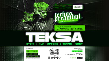 …. Connexion en cours 🆗 Entrer dans la matrice avec ̶N̶é̶o̶ Prelud le dimanche 20 avril prochain En cette veille de jour férié, nous vous entraineront dans un monde où la Tekno, la Hardtechno et la musique Rave y occupent tout l’univers sonore 💊 Pour vous accompagner, votre guide sera ̶M̶o̶r̶p̶h̶e̶u̶s̶ TEKSA (Elektrobooking, Omnilab, UGT) en live set. Teksa est un producteur français en provenance des volcans auvergnats. Signé principalement chez Omny Lab & Underground Tekno, il est un des acteurs majeurs de la scène acidcore, mentalcore et tekno en Europe. Ses live sets en constante évolution vous plongeront dans son univers aux kicks incisifs et aux basses percutantes. En support : 2T3M de Full Spectrum et nos dj Prelud : X - Plore, K-LU, TERMX & Shëp Suivez le lapin blanc pour toutes les infos 🐇 Line up : ⚫ Teksa live set (Elektrobooking, Omnilab, UGT) : Tekno/Mentalcore 🟢 2T3M (Full Spectrum) : Mentalcore/Acidcore ⚫ K-LU b2b X - PLORE : Hardtechno/Trance 🟢Shëp b2b TERMX : Hardtechno/Rave Encodage des informations supplémentaires 🆗 A cette occasion très spéciale, la fermeture du lieu se fera à 2h45 Prends la place bleu en ligne et tu auras ta place à 12€ Prends la place rouge sur place et tu payeras 20€ Infos pratiques : La Petite Halle - 53 Rue Vernouillet (Reims) 20h - 2h45 Bar et petite restauration sur place Fin de transmission 🟥