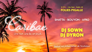 🔥 CARIBÆ – Une nuit. Une île. Un jeudi🔥 📍 Les Folies Pigalle 📅 Jeudi 19 février Paris bascule sous les vibes caribéennes. CARIBÆ débarque pour la toute première fois aux Folies Pigalle avec une nuit brûlante, élégante et sans compromis. Aux platines les meilleurs : 🎧 DJ SOWN 🎧 DJ DYRON Un voyage sonore entre Caribbean vibes, afro, shatta, bouyon, pensé pour celles et ceux qui vivent la nuit intensément. ✨ Une ambiance immersive ✨ Une sélection musicale pointue ✨ Une première édition qu’il ne faudra pas rater 🎟️ Invitations disponibles sur Shotgun CARIBÆ Une nuit. Une île. Un jeudi. 🕺🏽💃🏽 Let the vibes speak. UN ÉVÈNEMENT @caribae.event