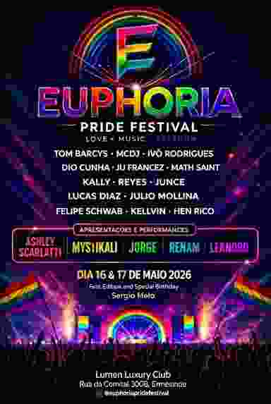 🌈✨ EUPHORIA PRIDE FESTIVAL ✨🌈 Prepare-se para viver uma experiência inesquecível onde a música, o amor e a liberdade se encontram numa celebração vibrante e cheia de energia! 💫 No dia 16 de maio, a partir das 23h, o Euphoria Pride Festival abre suas portas para uma noite épica com os melhores beats e performances que vão fazer você dançar até o último segundo! 🎶🔥 🎧 LINE-UP DE DJs: Tom Barcys • MCDJ • Ivö Rodrigues Dio Cunha • Ju Francez • Math Saint Kally • Reyes • Junce Lucas Diaz • Julio Mollina Felipe Schwab • Kellvin • Hen Rico 🌟 Performances especiais: Ashley Scarlatti • Mystikali • Jorge • Renam • Leandro Venha celebrar a diversidade, a alegria e a liberdade em um ambiente único, cheio de luz, cor e muita emoção! 🏳️‍🌈 ⏰ Início: 23h ⏳ Término: 20h 📍 Local: Lumen Luxury Club – Ermesinde Não fique de fora da primeira edição deste festival que promete marcar história! 🌈🪭 ( Em especial comemoração do aniversário do Sérgio Melo) 🌈✨ EUPHORIA PRIDE FESTIVAL ✨🌈 Get ready for an unforgettable experience where music, love, and freedom come together in a vibrant and energetic celebration! 💫 On May 16th, starting at 11 PM, the Euphoria Pride Festival opens its doors for an epic night with the best beats and performances that will keep you dancing until the very last second! 🎶🔥 🎧 DJ LINE-UP: Tom Barcys • MCDJ • Ivö Rodrigues Dio Cunha • Ju Francez • Math Saint Kally • Reyes • Junce Lucas Diaz • Julio Mollina Felipe Schwab • Kellvin • Hen Rico 🌟 Special Performances: Ashley Scarlatti • Mystikali • Jorge • Renam • Leandro Come celebrate diversity, joy, and freedom in a unique environment full of light, color, and emotion! 🏳️‍🌈 ⏰ Start: 11 PM ⏳ End: 8 PM 📍 Location: Lumen Luxury Club – Ermesinde Don't miss the first edition of this festival that promises to make history! 🌈 (Especially in celebration of Sérgio Melo's birthday)