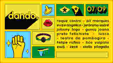 DANDO INDEPENDÊNCIA INDEPENDÊNCIA OU DANDO! PODE IR MAIS FUNDO QUE A GNT AGUENTA! DJS: Roque Castro Pil Marques Eva e Angélica Jerônimo Sodré Johnny bigu PERFO: Guma Joana Preto Fetichista Teatro da PombaGira VISUAIS:: Luzco Felipe Rufino Tico Volpato DOOR: Ewä Zezé Stella Pilagallo