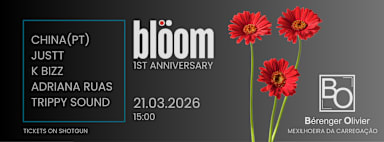 🏵️BLÖOM 1º Aniversário✨ 📅Sábado 21 de Março 🕛15:00h - 00:00h A blöom irá celebrar 🥂 o seu primeiro aniversário, dia 21 de Março, cujo dia assinala o inicio da Primavera🌺. Como nem todos devem saber, bloom significa florescer 🌼, daí a escolha desta data tão especial para comemorar o seu primeiro aniversário. 🏡O fantástico espaço, onde ira decorrer a celebração, será no BO - boutique hotel, foi escolhido , por ser um espaço bastante agradavel e acolhedor, com jardim 🌺exterior, digno de uma Matinëe épica!! Iremos começar às 15:00, no exterior, onde iremos ter 🎧djs, 🕺animação, ⚡tatuagens ,🖌️pinturas faciais e 🍔 comida. Vem juntar-se à celebração!🙏