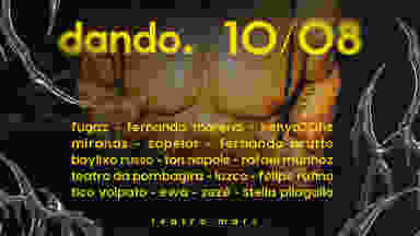 >>> DJS Fugaz Fernando Moreno Kenya20hz Mirands Zopelar >>> PERFO Fernando Brutto BoyLixo Russo Ton Napole Rafael Munhoz Teatro da PombaGira >>>>> VISUAIS Luzco Felipe Rufino Tico Volpato >>>> DOOR Ewa Zezé