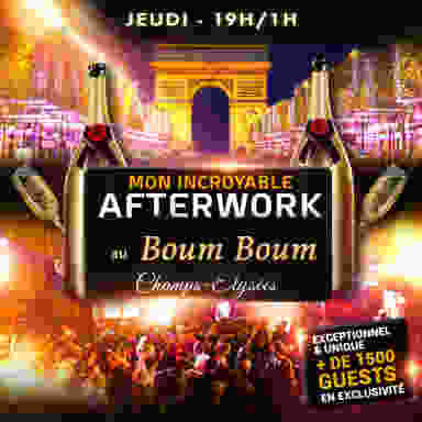JEUDI 25 AVRIL  AFTERWORK EXCEPTIONNEL AU BOUM BOUM CLUB PARIS ( CLUB DE 800M2 + GRANDE TERRASSE VUE ARC DE TRIOMPHE A 2 MINUTES Le Boum Boum c ' est l ' ancienne " VILLA CLUB " après de nombreux travaux et une nouvelle direction artistique nous avons le plaisir de vous convier dans ce tout nouveau club classé dans le TOP 3 à Paris, pour une Soirée de folie . AJOUTEZ NOUS SUR INSTAGRAM > https://instagram.com/soireeaparis75 Pour rappel, le club Boum Boum a ouvert ses portes au mois de septembre 2017. Il n'a pas fallu longtemps pour que ce club chic et branché devienne un élément emblématique de la vie nocturne parisienne avec deux atmosphères différentes : un bar lounge de luxe ou une boîte de nuit énergique parfaite pour apprécier la musique et danser à fond. Afterwork au Boum Boum Paris ce jeudi de 19h00 à 1h MAJESTUEUX ET PRESTIGIEUX LE BOUM BOUM CLUB ( ENORME CLUB, BOUDOIR, TERRASSE COUVERTE ET CHAUFFEE, FUMOIR) NOUS OUVRE SES PORTES POUR UN AFTERWORK DE FOLIE CE JEUDI Coupes à volonté , Softs, Buffet chaud et froid à volonté Offerts jusqu'à 21h Groupes d 'amis et sociétés peuvent bénéficier d' avantages. À deux pas de L’Arc de Triomphe (Champs-Elysées), découvrez le Boum Boum Club, un magnifique Club. Sous des étoffes de velours, pénétrez dans un salon avec ses fauteuils baroques, sa moquette épaisse, ses lustres brillant de mille feux, ses toiles tendues, tout a été pensé pour enivrer vos soirées. Un cadre historique et atypique, un service de qualité, tout sera fait pour vous faire rêver jusqu’au bout de la nuit. Tarifs : De 19h à 21h : Entrée 20€ avec pass sinon 25€ coupes à volonté, softs et buffet OFFERTS Pour tout groupe de plus de six personnes : Une bouteille offerte Après 21h : Entrée 20€ avec une conso Pack Bouteille 150€ : Coupes + Buffet + 4 Entrées + Table et bouteille au choix Particuliers et entreprises bénéficiez d'avantages ! Accès prioritaire, Coupe-file, soirées anniversaires, comité d'entreprise, espace privatif Contactez nous au 0612143573 ou resa.afterwork@gmail.com De 19h / 21h : Open Bulles et Ambiance lounge et cosy de 21h à 1h: Dance floor geant avec plus de 600 guests en folie Quoi de plus original que de faire la fête au Boum Boum Club Paris ! Alors après le bureau, rendez vous dès 19h aux distributeurs du bonheur ! On se retrouve en début de soirée dans une ambiance lounge dès 19h avec un excellent buffet et coupes offerts jusqu'à 21h. Chic & Cosy Ambiant pour siroter, discuter, rencontrer...Et pour danser sur vos tubes préférés ! Dress code : tenue correcte demandée LE BOUM BOUM CLUB 37, AVENUE DE FRIEDLAND 75008 PARIS
