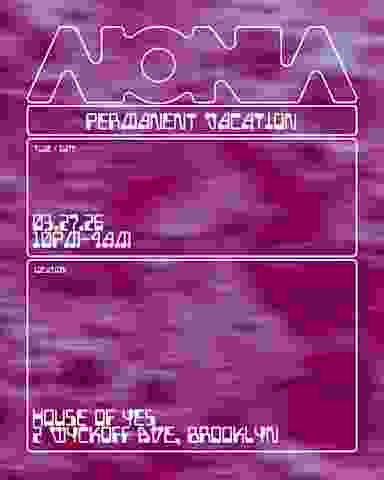 AIONIA returns to House of Yes for a full takeover celebrating 20 years of Permanent Vacation — marking the label’s first-ever NYC showcase. Founded in 2006 in Munich, Permanent Vacation has become a reference point for modern disco and its wider orbit: Balearic, cosmic, proto-house, and left-of-center club music. With releases from artists like Todd Terje, Prins Thomas, John Talabot, Red Axes, and Mano Le Tough, the label has helped shape the sound of contemporary dance floors worldwide. This showcase isn’t about nostalgia. It’s about carrying that spirit into the present — a night built on flow, atmosphere, and long-form dancing. ⫸ LOOKS Fashion-forward clubwear ⫸ MUSIC House — disco, balearic, cosmic, proto-house Lineup coming soon ;) ⫸ ABOUT AIONIA is a New York-rooted platform with a European sensibility, defined by refined curation, music-first experiences, and serious dance floors. ⫸ EXPERIENCES Performances and activations that may involve fresh fruit, feelings, mild confusion, time-dilation, and enthusiastic consent. We can’t tell you what’s happening yet — only that it will be weird, wild, and wonderful. ⫸ GROUPS & RESERVED TABLES We offer packages for groups, special celebrations, or just because you’re fabulous. Book yours at houseofyes .org/tables or reach out to reservations@houseofyes.org ⫸ GET ON THE LIST Subscribe for first access to tickets and special invites: houseofyes .org/yesemails ◆ SAFER SPACES POLICY ◆ House of Yes is a space for everyone to feel welcome. We have zero tolerance for harassment, unwanted touch, and discrimination. Always ask before touching anyone. If someone is making you uncomfortable, speak to a security guard or ask for a manager — we will help you. All restrooms are gender-neutral. Learn more at houseofyes .org/safer ◆ INFO & FAQ ◆ 21+ | No Re-Entry | No Refunds More questions? houseofyes .org/FAQ