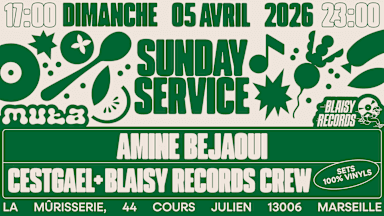 Blaisy Records & Muta se retrouvent et s’associent pour le dernier Sunday Service à la Mûrisserie ! Muta invite derrière les fourneaux pour ce Sunday Service le chef Amine Bejaoui aka @amineee. 🍽️ Ce qui l’anime dans les différents domaines auxquels il touche est l’intérêt pour les autres et le sens de la communauté. Cela se ressent dans ses plats qui transmettent un peu de sa Tunisie natale à chaque bouchée. Pour l’occasion Blaisy Records invite @cestgael, cofondateur du collectif @zerozero et du restobar hi-fi @doublezero. 💿💿 Il va donc passer des vinyls au côté du Blaisy Records Crew pendant 6 heures dont 2 heures de set qui seront enregistrées et diffusées pour l’émission @maisonjazz du mois de mai sur @pinataradio ! Au programme : jazz, hip-hop, funk, soul, disco. 🎲 Les potos de @trictrac seront là pour ramener leur backgammons qui seront mis en libre service pour jouer toute l’après midi ! 🎨 L’artiste @johanbaggio célébrera son vernissage et fera une performance de live painting ! 📆 Dimanche 5 avril 2026 🕔 17h-23h 📍La Murisserie, 44 cr Julien 13006 Marseille 🎟️ Entrée Libre On va clôturer notre résidence à la Mûrisserie en beauté pour ce dernier Sunday Service haut en couleur. ✌️😘❤️ Artwork : @cassiopee