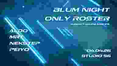 BLUM NIGHT / ONLY ROSTER ! Le collectif BLUM s’empare du Studio 56 pour une nuit multicolore de la techno à la hardtechno. https://www.instagram.com/blum.agence/ https://shotgun.live/fr/venues/blum-agency BLUM est une agence de profils montants, accessibles, avec un vrai potentiel. Producteurs de qualité, leurs sons sont téléchargés et joués par les meilleurs : Pegassi, IHM, TranceMaster Krause, Caravel, Dion, Kozlov, Vendex etc... TIMETABLE 23H00 ALDO (MENTAL / GROOVE TECHNO) https://www.instagram.com/aldo _pesamosca/ https://soundcloud.com/aldopesamosca 01H00 NEKSTEP (BOUNCY / TRANCE) https://www.instagram.com/nekstep_ music/ https://soundcloud.com/nekstep 02H45 MRT (ACID / HARDTECHNO) https://www.instagram.com/mrt music/ https://soundcloud.com/mrttttt 04H15 PEIYO (HARDTECHNO & MORE) https://www.instagram.com/ __peiyo https://soundcloud.com/peiyooooo 06H00 B2B2B2B2B 07H00 END 📍 LIEU Studio 56 56 rue de la Fontaine au Roi, 75011 Paris 🕚 HORAIRES Samedi 04 Avril 23h – 7h ℹ INFOS tolérée. 🖤 Bienveillance & inclusivité : aucune forme de discrimination ou de harcèlement ne sera En cas de souci, prévenez immédiatement la sécurité ou un membre de l’équipe