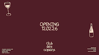 CLUB DES COPAINS 🍷 OPENING THURSDAY 12 FEBRUARY THÈME - NICOIS - Le Club des Copains se réunit chaque jeudi soir au Port de Nice. Dès 18h, on se retrouve entre locaux pour un aperitivo. À partir de 20h, le bar se transforme en restaurant de partage : menu unique 39€ / pers, lumières à la bougie, musique live de quartier. Tapas faits avec amour, belles bouteilles ouvertes, grandes tables et belles rencontres. Venez picorer chez votre voisin et partager le moment, le temps d’une soirée. Team Club des Copains - 18H - 20H APÉRITIVO 20H - 22H30 MENU DES COPAINS & LIVE MUSICAL ENTRE COPAINS 🍽️🎸 ( Réservation Obligatoire ) 22H30 - 00H AFTER DES COPAINS WITH COCKTAILS - INFORMATIONS Every Thursday From 18:00 to 00:00 Club des copains For more information, please contact: +33.7.68.94.00.48 Olivia team des copains