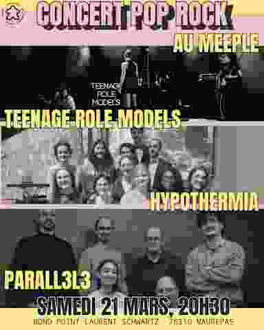 🎸 CONCERT POP ROCK AU MEEPLE 🎸 Préparez-vous pour une soirée 100% live avec trois groupes, trois univers et une seule mission : faire vibrer le Meeple 🔥 Au programme : - Teenage Role Models : énergie brute et vibes rock modernes - Hypothermia : un son intense et puissant qui ne vous laissera pas indifférents - Parall3l3 : des mélodies efficaces et une présence scénique qui envoie 📅 Samedi 21 mars ⏰ À partir de 20h30 📍 Meeple Bar - Rond-Point Laurent Schwartz, 78310 Maurepas Ambiance conviviale, bières fraîches, planches à partager et gros son toute la soirée ! Ramenez votre team et venez soutenir la scène live locale au Meeple ! On vous attend devant la scène 🤘
