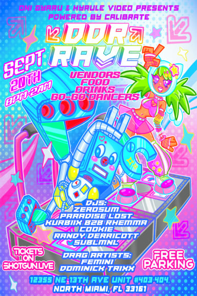 DDR RAVE ⬆️➡️⬇️⬅️ Presented by Oni Gyaru & Hyrule Video Powered by Calibrate Y'ALL READY FOR ROUND 2!?🔥 DDR Rave is back in North Miami 🎉✨ Let's reach that AAA score and have a MARVELOUS night 🪩 This time will be even better than the last 😉 DON'T MISS OUT! (⁠ ⁠/⁠^⁠ω⁠^⁠)⁠/⁠♪⁠♪ September 20th 8pm-2am 18+ North Miami Free Parking Djs: @Zerosum @Paradiselost_dj @Kurbiix B2b @Rhemmasfz @Cookiefgc @Djranz1989 @Sublmnlmusic Drag artists: @Katfemini @Dominick.trixx Photographers: @senpai_bluez @elkies_lens Vendors Food Drinks Go-Go Dancers Photobooth Tickets on Shotgun.live 12355 NE 13th Ave Unit #403-404, North Miami, FL 33161