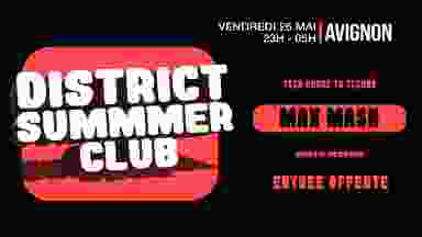 DISTRICT SUMMER CLUB - TOUS LES VENDREDIS ENTREE OFFERTE TECH HOUSE TO TECHNO Vendredi 26 Mai MAX MASH (Tech House to Techno) Dimitri Serrano ( Tech House) ⏰ 23h00 - 05h00 🅿️ Grand parking gratuit et surveillé 🎯 Club situé à 5min d’Avignon