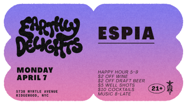 Brooklyn's ESPIA takes over the decks for a chill Monday at Earthly. DRINK SPECIALS::HAPPY HOUR 5-9PM $2 OFF WINE $2 OFF DRAFT BEER $5 WELL SHOTS $10 ALL SPECIALITY COCKTAILS