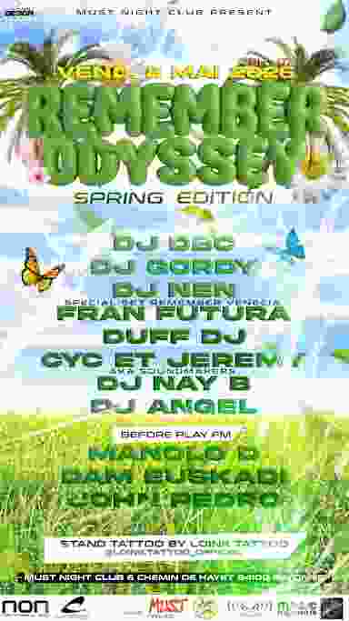 🌸✨ REMEMBER ODYSSEY – SPRING EDITION ✨🌸 La saison des beaux jours arrive… et avec elle, une nouvelle nuit inoubliable 💥 Prépare-toi à replonger dans l’univers ODYSSEY pour une édition SPRING survoltée ! 📍 Rendez-vous au Club Le Must à Bayonne 🎶 Les meilleurs sons qui ont marqué nos soirées, remixés pour une ambiance encore plus explosive 💡 Show lights, énergie printanière et vibes uniques toute la nuit Que tu sois un habitué ou prêt à découvrir l’expérience, cette soirée est faite pour toi. Ramène ta team, lâche prise et viens écrire un nouveau chapitre de l’Odyssey 🌀 🌙 Let’s remember. Let’s dance. Let’s live. ENTRÉE 10 euros en pré ventes ou 15 sur place.