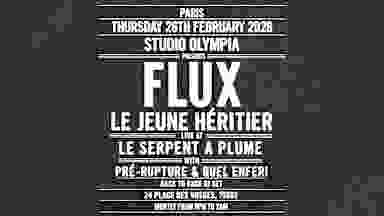 Studio Olympia is pleased to present Flux Live at le Serpent A Plume FLUX is a trio hybridizing razor-sharp electronic sequences with abrasive post-punk guitars and the disillusioned voice of a gutter crooner. A decadent and cathartic atmosphere for fallen young heiresses and dandy vagabonds. After the Live show the night goes on with Pré-Rupture X Quel Enfer on the decks ( B2B Dj Set ) untill Late. Doors Open at 8 PM Live Show at 9:30 PM Dj Set starting from 11:00 PM Closing time 02:00 AM Tickets available at the door and Online