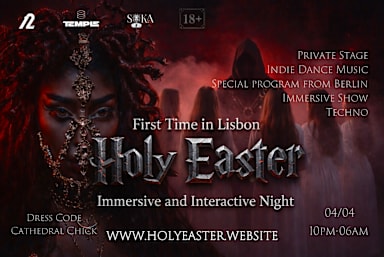 04/04 — For the first time in Lisbon: Immersive & Interactive Night — Holy Easter Dress Code: Cathedral Chick 18+ On Easter night, together with the Berlin project SUKA, the club Temple will transform into a truly unique experience. Artists, performers, musicians, and guests will immerse themselves in the atmosphere of a mysterious temple blended with sensual fashion aesthetics. Headliners The Aksis Acid techno project by Anna Kupriienko (one half of Bloom Twins). Raw. Driving. No compromise. Pure function and impact. She has performed alongside artists such as Miss Monique, Eelke Kleijn, Klangphonics, and Deer Jade, and appeared at venues and events including Muse & Soho (Seoul) and MEKA Festival Thessaloniki (shared bill with NIKOLINA). Boho A Berlin-based electronic music project founded in 2017 by Jannowitz Records founder Lars K. Starting from iconic Berlin clubs like KitKatClub and Insomnia, BOHO has since toured across much of the world. Moving effortlessly between House and Techno, BOHO rejects fixed formats and predictable narratives. His tracks, released on some of the strongest labels in the scene, have gained millions of listeners and are well known among true connoisseurs of quality techno. Line-up also includes • Misha Svirid • Ante Perry • Artemios Trigo • Vlada Chipa • God Inside • Vlad LX • Tanya Rum Special Experience Guests will discover a special program including: • a private stage • the opportunity to confess with the Father and his attendants • and other immersive surprises throughout the night. ⚠️ Important: To access the private room, registration on the website is required: www.holyeaster.website For more details, follow us on Instagram or check our website. Stay updated via: Instagram — @monkeyunit12