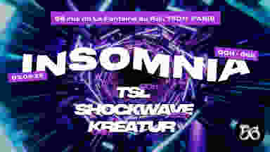 🌙 MERCREDI 3 SEPTEMBRE 2025 – INSOMNIA 🌙 Quand la nuit s’allonge et que le sommeil disparaît, INSOMNIA revient hanter le Studio 56. Un voyage sonore intense, entre nappes hypnotiques, kicks puissants et grooves sombres, taillé pour les insomniaques de la nuit parisienne. Préparez-vous à une immersion totale jusqu’au lever du jour. ▬▬▬▬▬▬ TIME TABLE ▬▬▬▬▬▬ 🔥 00H – TSL IG :https://www.instagram.com/tsl__music SC :https://soundcloud.com/user-498587207 ⚡ 02H – SHOCKWAVE IG : https://www.instagram.com/shockwave.zik SC : https://soundcloud.com/shockwavezik 🌑 04H – KREATUR IG : https://www.instagram.com/kreatur_dj SC : https://soundcloud.com/kreatur_dj #Studio56 #InsomniaParis #WednesdayRave #TechnoNights #TSL #Shockwave #Kreatur #HardTechno #HypnoticGrooves #DarkBeats #UndergroundParis #StudioNights ▬▬▬▬▬▬ INFOS PRATIQUES ▬▬▬▬▬▬ 📅 Date : Mercredi 3 Septembre 2025 ⏰ Horaires : 00H / 6H 🎶 Styles : Techno / Hard Techno / Hypnotic / Dark Groove 📍 Lieu : Studio 56 56 Rue de la Fontaine au Roi, 75011 Paris Ⓜ️ M°3 - Parmentier Ⓜ️ M°5/8/9/11 - République Ⓜ️ M°11 - Goncourt ▬▬▬▬▬▬ 𝖳𝖠𝖱𝖨𝖥𝖲 & 𝖳𝖨𝖢𝖪𝖤𝖳𝖲 ▬▬▬▬▬▬ 🎟 Early Members Tickets : 7,99€ 🎟 Regular Members Tickets : 8,99€ 🎟 Regular Tickets : 10,99€ ✅ Tickets dispo sur place : 13€ ⚠️ Vestiaire obligatoire : 2,00€ ▬▬▬▬▬▬ RÈGLES DE VIE ▬▬▬▬▬▬ ⛔️ Aucun comportement déplacé (racisme, sexisme, homophobie…) toléré 🔞 Interdit aux moins de 18 ans 💪 Pas de violence sous peine d’exclusion ⚠️ Respectez le lieu qui nous accueille 🏳️‍🌈 LGBTQIA+ friendly 💊 Faites attention à ce que vous consommez 🍸 L’abus d’alcool est dangereux pour la santé 💧 Buvez de l’eau régulièrement ⚠️ IMPORTANT ⚠️ Événement réservé aux adultes. L’entrée sera refusée aux personnes en état d’ivresse ou sous influence de drogues. Aucune forme de comportement violent ou discriminatoire ne sera tolérée. La sécurité et le respect de tous sont notre priorité.