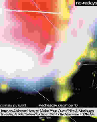 Join us for a hands-on, four-hour workshop designed to get you comfortable with Ableton Live’s core functionality. Whether you’re a total beginner or looking to refine your workflow, this immersive session will guide you through the essentials of crafting your own edits and mashups. After a two-hour lecture, stay for two hours of lab time, where you can connect with peers, exchange ideas, collaborate, and test your tracks on the club’s sound system. Please bring your own audio files (WAV, AIFF, or MP3). No prior experience required. Tickets are $20, and space is limited. Laptops with Ableton Live 12 Suite and headphones are highly recommended. You can access a free 30-day demo of Ableton Live 12 Suite via the promotional links provided. Discounts are available upon request. This event is hosted by The New York Record Club for the Advancement of the Arts and JP Solis, co-founder of Dubspot, the first Ableton Certified Training Center in North America. /// Entry is at the discretion of our door staff. Online purchases are limited to four tickets maximum per person. If tickets are sold out here, we always hold a good amount at the door. We will do our best to admit those without tickets but entrance is not guaranteed. Violence, non-consensual touching, racist, homophobic, transphobic, sexist, ageist or other discriminatory language, and leering are not allowed within our walls or in our back yard. If someone says or does something to make you feel uncomfortable while you’re here, let us know. /// Accessibility: The wheelchair entrance to our indoor space is in the driveway, which is the access point most commonly used to enter Nowadays. During parties the driveway gate is locked, so please ask staff at the street entrance for assistance with entry. All of our bathrooms are gender-neutral. There is one accessible stall indoors. Just ask any Nowadays staff member for the key, and they can show you the way. During parties, seating is available both on and off the dance floor. While we don’t have a dedicated quiet space indoors during parties, the booths next to coat check are a little quieter, and the deck and back yard a little quieter than that. Most nighttime parties include the use of strobe lights and water based haze.