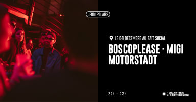Pour celles et ceux qui ne connaissent pas les JEUDI POLAIRE, c’est un avant gout épicé de ton week-end enneigé. C’est aussi la raison de ta gueule de bois du vendredi matin, où tu ne te souviens plus de rien. Plus sérieusement, les JEUDI POLAIRE, c’est surtout du bon son en format intime au Fait Social, avec des collectifs ou des DJ (presque) toujours du coin. Pour l'occasion, on invite des nouvelles à tête à se produire au Fait Soc'. Prêt·es à découvrir de nouvelles vibes ? ▬▬▬▬▬▬▬▬ LINE UP ▬▬▬▬▬▬▬▬▬ ▸ MOTORSTADT (Styles : Acid Body Music, Trash Techno) Motorstadt, c'est du crado boum-boum composé par Wesh Craven et Tarek From Belleville qui se spécialisent dans le cassage de gueules techno-punk, invoquant à chacun de leurs sets les esprits-frappeurs de l’EBM dans une transe électrisante, synthétique et acide. https://www.instagram.com/motorstadt161?igsh=MWR1cDU5aDB2dHFxbw== https://on.soundcloud.com/3WILo4xTSWnXskTHdC ▸ BOSCOPLEASE (Styles : Hyperpop, Bailey, Trap) Entre hyperpop japonais, bailey français et EDM arabe, aucune frontière ne retient boscoplease qui projette des jets de remix et de bangers faits maison ou venant du monde entier. L'expression digitale et festive de la genZ coulent dans les veines du duo rouennais. https://youtu.be/Hnc3fal5ahk?si=6hwX6jOgfgQMp6fi ▸ MIGI (Styles : Tribe, Forest, Break, Techno) MIGI est un-e DJ et producteur rouennais-e naviguant entre sonorités acides, rythmes Techno soutenus et nappes psychédéliques et mentales. https://www.instagram.com/migi_wav?igsh=MTRxZW84ajNveGg2dA== https://on.soundcloud.com/m62A5ApIjI7wAxxSAJ ▬▬▬▬▬▬▬▬ ‼️ 𝘼 𝙇𝙄𝙍𝙀 𝙄𝙈𝙋𝙀𝙍𝘼𝙏𝙄𝙑𝙀𝙈𝙀𝙉𝙏 Le Fait Social (comme le Quartier Libre) se veut être un lieu inclusif qui accueille toutes les communautés. Aucun comportement discriminatoire, haineux ou violent (racisme, sexisme, homophobie, transphobie, harcèlement, etc.) ne sera toléré, que ce soit parmi l’équipe ou le public. Tout propos ou geste discriminatoire entraînera une exclusion immédiate. En cas de problème du type harcèlement ou agression, vous pouvez vous adresser à notre équipe bar ou à nos agents de sécurité qui vous prendront immédiatement en charge. Prenez soin de vous et des autres ❣️ 📍 𝙋𝙊𝙄𝙉𝙏 𝘼𝘾𝘾𝙀𝙎 LE FAIT SOCIAL, établissement dans le Quartier Libre de Rouen 1 rue Malouet 76 100 Rouen Accès en F1/F7 arrêt Champlain ou en métro arrêt Joffre-Mutualité ⌚️ 𝙋𝙊𝙄𝙉𝙏 𝙃𝙊𝙍𝘼𝙄𝙍𝙀𝙎 Ouverture des portes : 20h Fin du son : 01h45 📸 𝗗𝗥𝗢𝗜𝗧 𝗔 𝗟'𝗜𝗠𝗔𝗚𝗘 En réservant votre place pour cet événement, vous acceptez d’être éventuellement pris(e) en photo. Si une photo de vous est publiée sur nos réseaux et que vous ne souhaitez pas qu’elle y figure, merci de nous le signaler afin que nous la retirions.