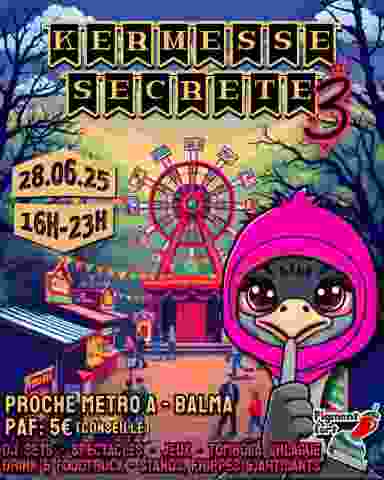 Attention attention, c'est l'heure de vous devoiler la toute nouvelle Kermesse secrète #3 "Retour en enfance !" Nous avons trouvé un nouvel endroit à proximité du métro Balma, donc accessible en transports en communs. 🚋 Le lieu sera dévoilé au dernier moment sur cette page, pour garder le mystère jusqu'au bout! Comme les autres Kermesses secrète, le but de cet événement est de se rencontrer, jouer, danser, chanter, apprécier les différents styles d'arts qu'on vous expose, tout ça pendant la journée, jusqu'à la nuit tombée. N'hésitez pas à venir tôt pour profiter des activités proposées l'après-midi comme la Tombola shlague avec de super lots bien shlagues à gagner ! 🎲 Il y aura aussi des escape game dans l'après-midi et des performances de graff. 🎵 Line up: Alec Pompot : Disco Girafurious : Hardgroove années 2000 L'Equipage: Open mic Rec-quiem : Rap cyber orchestral Ninka Circus : Performances feu Bien sûr, n'oubliez surtout pas votre plus beau déguisement qui vous rappelle votre enfance !🤩 L'équipe de Pigment Fort vous dit à bientôt ! 💶 Pas de CB, Préparez votre cash PAF: 5€ conseillé Gratuit pour les enfants 🥪🍿 Food trucks 🍺🍹Bar petits prix 🎲 Tombola shlague Escape game 🎵 Line up : -Pompot Disco House 17h -Girafurious Dance années 2000 18h -Open mic avec l'Equipage 19h -Rec_quiem concert de rap cyber orchestral 21h -22h15 Ninka circus Spectacle de feu 🔥Performances feu 🖼️Performances graff 🌈 Stand de créateurs locaux