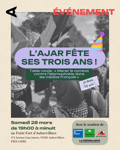 Le 28 mars, l'Association des Journalistes Antiracistes et Racisé·es fêtera ses trois ans au Point Fort d'Aubervilliers, de 19h à minuit. Au programme, une table ronde sur l'islamophobie dans les médias français et deux - merveilleux - DJ set pour fêter les trois ans d'existence de ce qui est arrivé de mieux au paysage médiatique français. Les détails sur la programmation arrivent très vite, restez connecté·es ici. Ouverture des portes : 19h TARIFICATION SOLIDAIRE ET RESPONSABLE Places disponibles en ligne et sur place le jour J Pour notre association aux moyens (très) limités, proposer une telle soirée implique de louer la salle, le matériel, défrayer les invité·es, rémunérer les artistes... Tout cela a un coût certain que nous ne pouvons assumer seul·es. Payer votre billet au juste prix, c'est aussi nous permettre de continuer à vous proposer ces rendez-vous. 0 euro : "Tu es dans une situation de grande précarité mais tu as très envie de venir." 5 euros : "Tu es dans une situation de précarité mais tu peux participer de manière symbolique." 10 euros : "Tu es assez à l'aise financièrement pour payer le juste prix pour cette soirée." 15 euros : "Tu roules carrément sur l'or, et on te remercie de partager un peu de ton patrimoine avec nous." 20 euros : "Tu roules carrément sur l'or, et on te remercie de partager beaucoup de ton patrimoine avec nous."