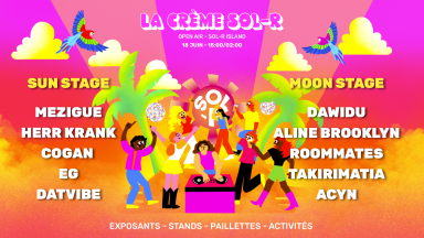La saison de open airs est déclarée ouverte et c'est le grand retour de la Crème SOL-R. 🏖🌴☀ Embarquement dans le vaisseau SOL-R, direction les étoiles a travers un voyage musical hors du commun! Au programme, une line up plus que pointue, mais aussi des créations immersives, des paillettes, un large choix d'activités et une variété de stands. 🌳 4000 m2 | 🎪 2 stages outdoor & indoor | 🎛 11h de son 🔈 D&B | 🌞 Scénographie SOL-R & MOON 🎪Village de stands, exposants artistiques & activités 📍 Ⓜ 1 minute 🌞 𝗦𝗨𝗡 𝗦𝗧𝗔𝗚𝗘 Mézigue (D.KO) Herr Krank (Chevry Agency) Cogan (House of Underground) EG (SOL-R) Dat vibe 🌝 𝗠𝗢𝗢𝗡 𝗦𝗧𝗔𝗚𝗘 Dawidu Aline Brooklyn (Imagine Family) RMMT- Roomates Takirimatia (SOL-R) Acyn (SOL-R) 🎪𝗩𝗜𝗟𝗟𝗔𝗚𝗘 𝗗𝗘 𝗦𝗧𝗔𝗡𝗗𝗦 & 𝗔𝗖𝗧𝗜𝗩𝗜𝗧𝗘𝗦 🧑‍🎨 Exosants artistiques & Live Painting I Bijoux 💍 I Vintage Shop 👚 I Paillettes ✨ I Vinyles 📀 I Tatoo 🐉 I 💆Massage I 🥙 Foodtrucks I 🧑‍⚕RDR 🏑 Molkky I 🏐 Pétanque I 🎰 Roue de la chance I 🥎 Chamboule tout ♻ 𝗘𝗡𝗚𝗔𝗚𝗘𝗠𝗘𝗡𝗧 𝗘𝗖𝗢𝗟𝗢𝗚𝗜𝗤𝗨𝗘 Lieu éco-responsable Line up 100% région parisienne Palettes biodégradables Shops parisiens, fait main et biodégradables Déchets recyclables En partenariat avec DJ4Climate action Partenariats VTC verts ☀☀☀ 𝗣𝗔𝗥𝗧𝗘𝗡𝗔𝗜𝗥𝗘𝗦 ☀☀☀ 🤝 DJ4Climate Action I Dure Vie I OXY I Electro News I Delighted & more TBC