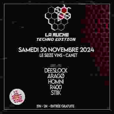 LA RUCHE : TECHNO EDITION Une édition spéciale TECHNO, pour son deuxième événement la Ruche vous prépare une soirée d'anthologie. Retrouvez le crew de LA RUCHE au SEIZE VINS à Canet en Roussillon (66140), le 30 novembre prochain ! Date: 30/11/2024 Horaires: 19h / 2h Entrée Gratuite *Line Up* _DEESLOCK _ARAGO _HOMNI _R400 _STIIK Un line up tourné LA RUCHE CREW qui vous fera voyager de la techno à la hard techno tout au long de l'évènement !