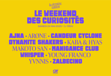 Le Weekend des Curiosités (PASS 1 JOUR - SAMEDI) : AJNA + ARØNE + CANDEUR CYCLONE + DYNAMITE SHAKERS + KABA & HYAS + MANIGANCE CLUB + MAKOTO SAN + WHISPER + YOUNG FRANCO + YVNNIS + ZALBECINO Cette année marque la 13e et dernière édition du Weekend des Curiosités dans son format actuel. Pour cette année particulière, l'équipe des Curiosités est fière de vous présenter les futures pépites musicales de la scène française ! Vous nous connaissez, l'ADN du festival reste le même : musique, découvertes, ambiance, partage et convivialité sont les maîtres mots des Curiosités. Nous avons hâte de vous retrouver du 23 au 25 mai 2025 au Bikini !