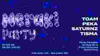 meraki prod présente sa première date : la meraki party #1 L'occasion de présenter les artistes émergent·es en qui nous croyions 💙 TOAM - SATURNZ - PEKA - TISMA @toam.rap @saturnz______ @peka.tplm @tisma.2se par @merakiprod.fr 📅 Mercredi 18 mars 2026 🕔 19h30 – 22h30 📍 Punk Paradise 🎵 Rap