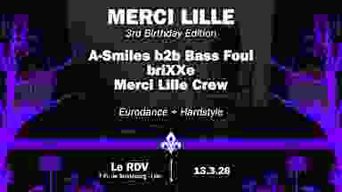 Happy birthday to us happy birthday to us… Ha vous êtes là vous aussi ? Bonjour. Je n'ai pas souvenir vous avoir invité à notre anniversaire pourtant. Bon ben, maintenant que vous êtes aussi au courant je suppose que j'ai l'obligation de vous dire ce que nous avons organisé pour nos trois ans ? Pour l'occasion on a prévu une double bringue avec doublement plus d'ahuris que d'habitude pour rentabiliser les derniers jours plus que comptés de notre pauvre DDJ-SX2 qui s'apprête à rendre l'âme (vu les horreurs qu'elle a du subir, rien de plus compréhensible)… Vous connaissez l'adresse, RDV au RDV (ptdr xD) le 13 mars pour une fiesta Eurodance et Hardstyle et le 14 mars pour une fiesta Drum & Bass et Neurofunk de degen. Programmation : 13 mars : briXXe A-Smiles b2b Bass Foul Merci Lille Crew 14 mars : Bianka Pilc b2b Virtoc Merci Lille Crew Débuts des hostilités à 20h ces deux jours jusque la fermeture à 2h A très vite !