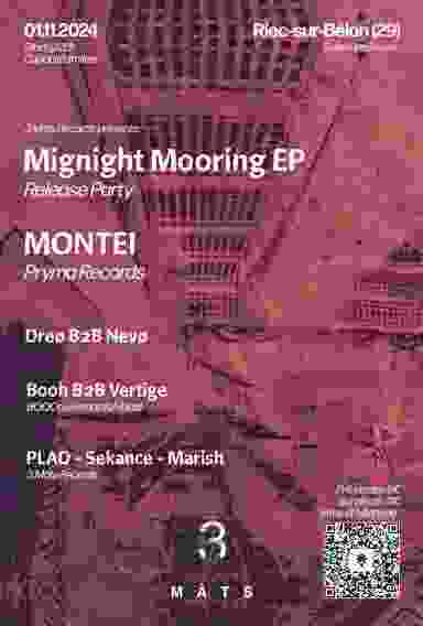 (English below) Pour célébrer notre nouvelle release "Midnight Mooring", nous avons l’immense plaisir d’inviter l’artiste derrière ce 4e opus : Montei. À la tête du label Pryma Records, Montei est l’une des figures actives de la scène électronique argentine. Producteur et Dj de talent, il organise également ses propres soirées avec son label Pryma, des deux côtés de l’Atlantique. Pour cette occasion, nous avons également convié quelques uns des moussaillons les plus aguerris de notre scène locale : --> Booh B2B Vertige (BOOOoo! Rec. / Volatil - Rennes) --> Dreo B2B Neveu (Lorient) Équipiers de longue date, ils mèneront la barre à nos côtés jusqu’à l’aube.. Billets : Préventes : 8€ | Sur place : 11€ Lieu : Riec-sur-Bélon (29) - Scène intérieure intérieur L’adresse exacte sera envoyée par email avec vos billets, et dévoilée le jour même sur nos réseaux. Capacité limitée | Bar | Soirée inclusive ------------------------—------------ Join the ship for a special night ! To celebrate our latest 4th release, "Midnight Mooring", we’re thrilled to invite the mastermind behind it : Montei. As the head of Pryma Records, Montei is one of the pro-active figures of Argentina’s prolific electronic scene. Not only is he a talented producer & Dj, but he also runs his own successful party series with his label Pryma, now making waves on our side of the Atlantic as well. For this special occasion, we’ve brought on board some solid local sailors we’ve been navigating with for a while now: -->Booh B2B Vertige (BOOOoo! Rec. / Volatil - Rennes) -->Dreo B2B Neveu (Lorient) They will lead the way with us until dawn.. Tickets: Pre-sales: 8€ | At the door: 11€ Location: Riec-sur-Bélon (29) - Indoor Exact location will be sent via email with your ticket, and revealed the day of the event. Limited capacity | Bar | Inclusive party