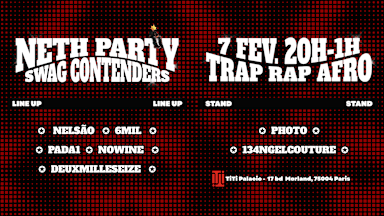 NETH PARTY SWAG CONTENDERS On vous invite a la première soirée made by NETH 🌟 20H - 1H Au programme : 🎛️ DJ SETS - NELSÃO - PADA1 - 6MIL - NOWINE - DEUXMILLESEIZE TRAP / RAP / AFRO 📸 Stand photo gratuit qui donnera lieu à un concours du meilleur swag, avec des cadeaux à la clé pour les gagnants 🎁 🪡 Stand de @134ngelcouture qui proposera ses créations 📹 Diffusion en live de l’événement par Lloyd (@lloydlebon sur Twitch), avec des animations 🔞​ La consommation de boissons alcoolisées est strictement interdite aux mineurs.