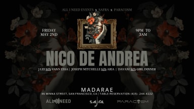 Friday, May 2nd All I Need Events, Safra & Paracosm invites you to show with NICO DE ANDREA at exclusive brand new boutique Lounge MadaRae ►LINE UP NICO DE ANDREA J LEI b2b VANN ESSA JOSEPH MITCHELLE b2b ARIA DAVANI b2b GIRL DINNER ►FOR GUEST LIST, TICKETS & TABLES GUEST LIST, TICKETS & TABLE For Bottle Service & Table Reservation, please text us at (415)-684-5045 This show will sell out in advance, get discounted ticket now! *TICKET SALES ARE FINAL AND NON REFUNDABLE.* ►FOLLOW/ LIKE OUR PAGE ON INSTAGRAM : https://www.instagram.com/allineedevents/ FACEBOOK : https://www.facebook.com/allineedevents/ ►HEADLINER BIO NICO DE ANDREA ►ABOUT THE VENUE MADARAE, THE NEW STANDARD FOR SAN FRANCISCO NIGHTLIFE! Madarae is San Francisco's newest nightclub featuring world famous house DJs with state of the art sound and lighting but in an intimate setting. Immersing the crowd in amazing sound and visuals while up close and personal to the DJ. Madarae 46 Minna, San Francisco 9pm-3am | 21+ with Valid ID