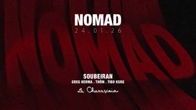 Portée par l’énergie de sa première saison, Soubeiran revient avec NOMAD à La Churascaia pour une deuxième saison encore plus intense et plus libre, toujours fidèle à son identité musicale. NOMAD, c’est une expérience unique, une atmosphère à part et une énergie fédératrice qui s’installera de nouveau à La Churascaia pour des dates exclusives. Soubeiran - Greg Herma - Thöm - Tibo Ksrg ✤ ✤ ✤ ✤ ✤ ✤ Établissement réservé aux personnes majeures (contrôle d'identité avec pièce d'identité valide et non présentée sur téléphone) ✤ ✤ ✤ ✤ ✤ ✤ La Churascaia Saint Anne 30600 Vauvert.