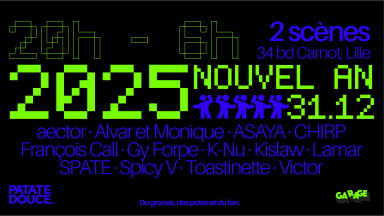Du Groove, des potes et du fun. HOUSE • HARDGROOVE • TECHNO Rendez-vous le 31 décembre chez nos amis de Garage pour dire au revoir à 2024 ⬇️ → 20h-06h (10h de son sans interruption pour votre plus grand bonheur) → 1500m2 d’espaces dancing et chillance → 3 Bars → 2 superbes scènes → Que des dj locaux que t’aimes d’amour mais aussi des guests → Scénographies Patate Douce appellation d’origine contrôlée (SPDAOC) → Vraiment pleins pleins pleins de surprises 2024 a été une dinguerie totale pour Patate Douce : des soirées folles, des nouvelles rencontres, des projets qui ont grandi grâce à vous. On n’aurait jamais imaginé arriver là où on en est aujourd’hui, alors merci du fond du cœur. Pour célébrer cette année incroyable, quoi de mieux que de la finir ensemble, sur le dancefloor, face à nos scénographies et sous notre système son signés SL Events ? 🎫 10€ avec une coupe de bulles offerte (venez tôt pour éviter d’être bloqué à l’entrée à 00h comme les retardataires de l’année dernière ❤) 📍 Où ça ? Vous connaissez la recette, on se retrouve à Garage, l’un de nos plus fidèles partenaires. Pour ceux qui découvrent : on parle de 1500 m2 carrés dans un ancien garage automobile en plein cœur de Lille. Merci à tous de faire grandir le projet avec nous et d’être au rendez vous à chacun de nos événements 🍠